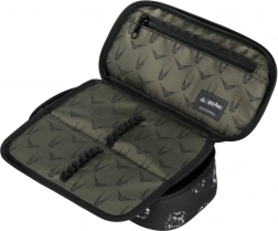Buzunarele interioare și benzile elastice permit o organizare ușoară a obiectelor de scris, iar căptușeala verde cu motive de creaturi înaripate adaugă un farmec unic.