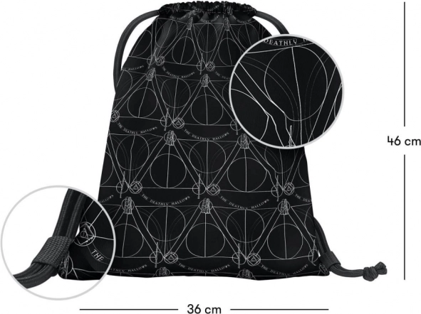 Designul este decorat cu un model repetitiv al simbolului familiar al talismanelor morții, ceea ce conferă rucsacului un aspect unic și stilat, ideal pentru fanii lui Harry Potter.