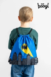 Săculețul albastru este decorat cu logo-ul iconic al lui Batman și un motiv urban unic.
