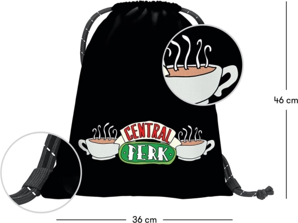 Sacul pentru pantofi cu motivul 'Central Perk' din celebrul serial Friends este un accesoriu excelent pentru fani. Acest sac stilat și practic este fabricat din material textil rezistent și lavabil. Datorită șnururilor rezistente, poate fi purtat cu ușurință pe spate.