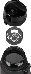Capacul blocabil cu siguranță previne deschiderea accidentală în rucsac, iar mecanismul flip-top permite băutul rapid cu o singură mână. Sita detașabilă este utilă pentru limonade cu fructe sau ceaiuri vrac – materialul este potrivit și pentru băuturi fierbinți. Include o curea pentru purtare comodă.