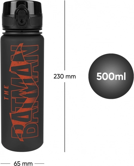 Această sticlă neagră cu logo-ul roșu iconic BATMAN impresionează prin design și practicitate. Corpul ușor din tritan durabil se ține ușor în mână, nu absoarbe mirosuri și este sigur pentru sănătate (fără BPA, PVC și ftalați). Volumul practic de 500 ml și scara gradată clară pentru controlul aportului de lichide o transformă în partenerul ideal pentru fiecare zi.
