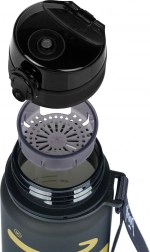 Sticla practică și rezistentă din tritan, cu volum de 500 ml, este ideală pentru școală, muncă și sport. Are capac flip-top cu blocare împotriva scurgerilor, sită pentru fructe sau ceai și curea comodă pentru transport. Materialul sigur fără BPA nu miroase a plastic și este potrivit și pentru băuturi fierbinți.