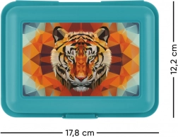 Cutie din plastic turcoaz cu grafică colorată cu tigru pe capac, care adaugă stil fiecărui prânz.