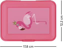 Cutia atrage privirile din prima datorită motivului jucăuș cu flamingo pe capac. Combinația de culoare roz și motivul vesel înviorează orice prânz.