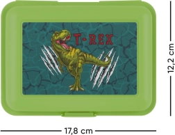 Cutie pentru prânz cu stil, cu motiv T-Rex este ideală pentru aventurieri mici și mari. Această cutie din plastic verde este echipată cu un sistem practic de închidere cu un singur lacăt și un separator pentru organizarea ușoară a alimentelor. Ușor de transportat și ideală pentru utilizare zilnică.