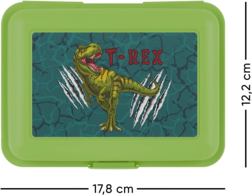 Cutia pentru prânz are pe capac un design atrăgător cu T-Rex completat de textul roșu 'T-REX', ceea ce o face atractivă pentru copii.