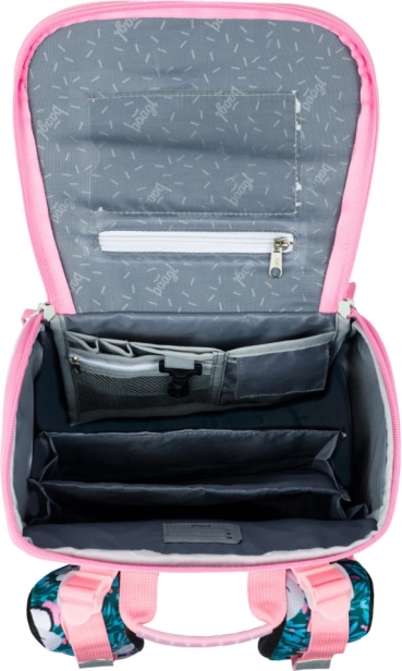 Sistemul de deschidere rabatabilă facilitează manipularea la bancă. În interior se află un buzunar transparent pentru orar și un organizator cu elastic pentru fixarea caietelor. Buzunarele laterale din plasă sunt ideale pentru sticla de apă, iar buzunarul frontal izolat protejează gustarea.