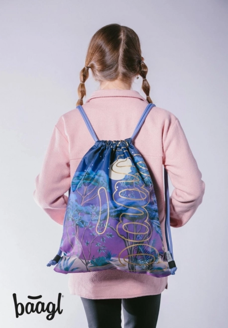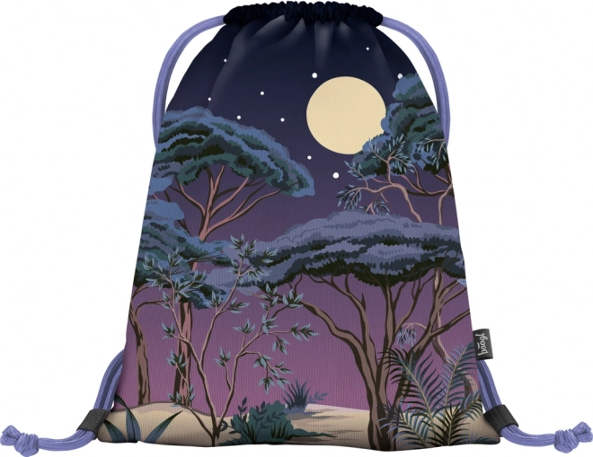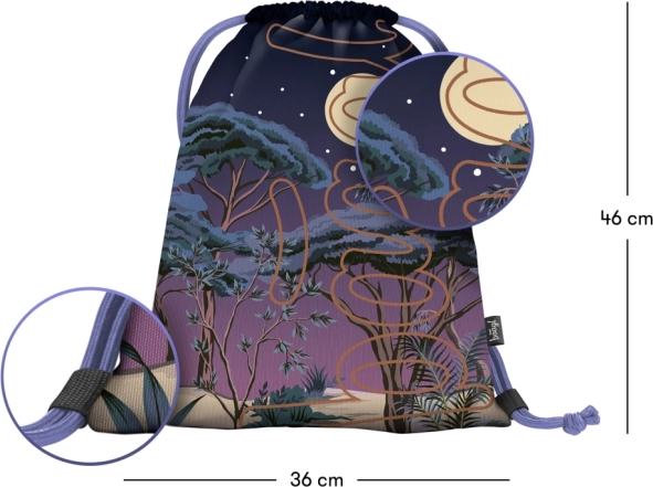Rucsacul este decorat cu un design nocturn cu pădure, lună și stele, ideal pentru utilizare în aer liber sau în timpul liber.