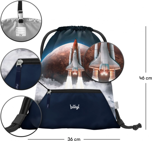 Săculețul BAAGL Space Shuttle completează perfect echipamentul școlar datorită carabinei, care permite atașarea acestuia la ghiozdan. Este fabricat dintr-un material rezistent, care asigură durată lungă de viață și întreținere ușoară. La baza săculețului se află un buzunar practic cu fermoar pentru depozitarea micilor obiecte.