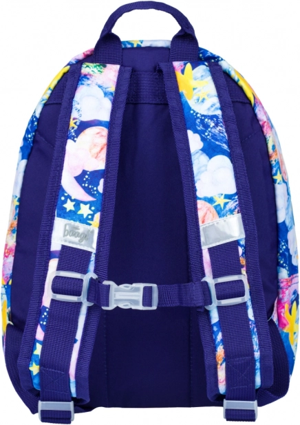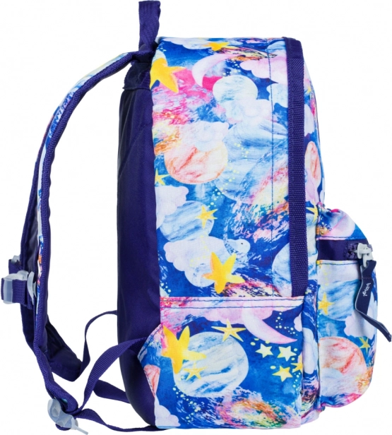 Stele, planete și nori colorați pe fundal albastru vor încânta orice copil și oferă rucsacului un aspect original, care iese în evidență la grădiniță și în excursii.