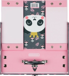 Mânerul metalic este comod de prins, iar catarama clasică păstrează conținutul în siguranță. Servieta este ideală pentru materiale de lucru creative, caiete, jucării mici sau comori de călătorie. Motivul adorabil cu panda și tonurile roz o transformă într-un accesoriu îndrăgit pentru școală și excursii.