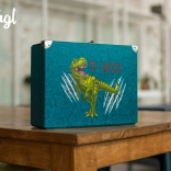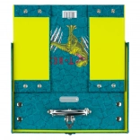 Servietă școlară stilată cu motiv T‑REX din carton laminat rigid, oferă structură pliabilă cu capse, feronerie rezistentă cu colțuri întărite și mâner metalic pentru transport comod. Închiderea sigură cu cataramă protejează conținutul, iar designul turcoaz‑galben intens îi va încânta pe toți elevii.
