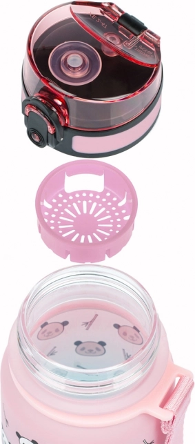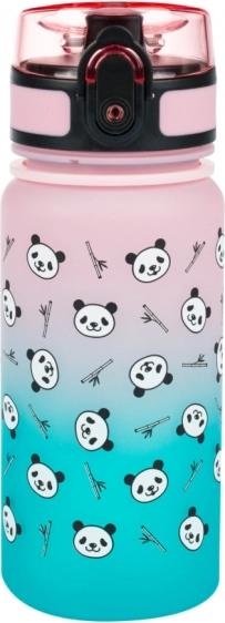 Sticlă pentru copii BAAGL adorabilă și rezistentă, cu motiv panda și gradient colorat, oferă un volum de 350 ml, capac etanș cu blocare, curea practică și strecurătoare pentru fructe sau ceai. Fabricată din tritan certificat fără BPA, PVC și ftalați – fără miros, sigură chiar și pentru băuturi fierbinți.