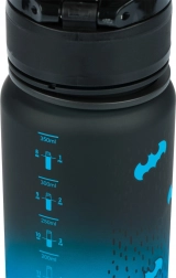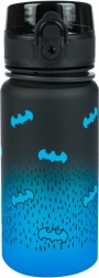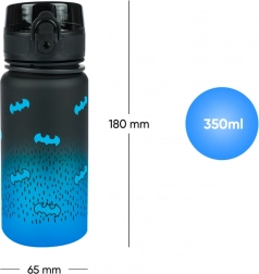 Sticlă din tritan cu motiv BATMAN în gradient albastru–negru, cu volum de 350 ml, capac cu sistem de blocare împotriva scurgerilor, curea/prindere practică și sită pentru fructe sau ceai. Fabricată din tritan sigur, fără BPA, ideală pentru școală, sport și excursii.