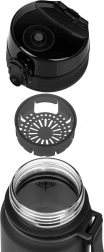 Sticla stilată din tritan, cu volum de 350 ml, este ideală pentru școală, excursii și sport. Oferă capac cu blocare împotriva scurgerilor, curea practică pentru purtat și sită pentru băuturi aromatizate. Fabricată din tritan fără BPA, fără miros, potrivită și pentru băuturi fierbinți.