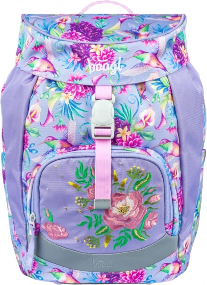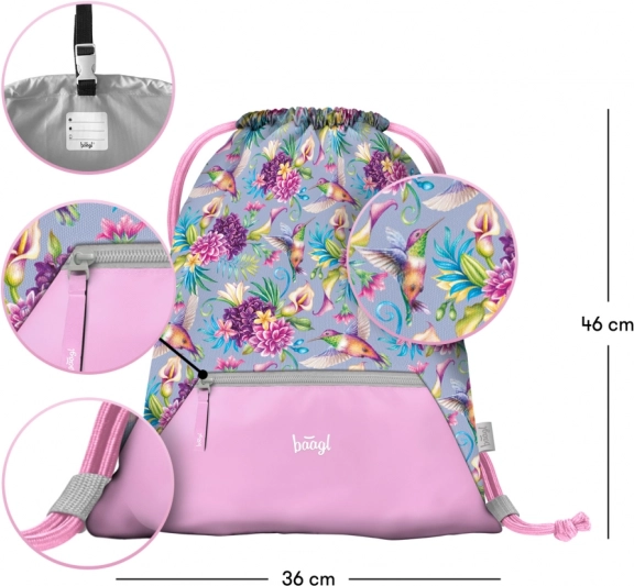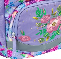 - Design: motiv jucăuș cu colibri și flori; rucsac, penar și săculeț asortate.