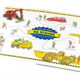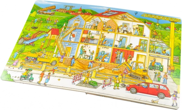 În oraș se întâmplă mereu câte ceva – se sapă, se repară, se construiește și se înfrumusețează. Copiii vor căuta pe pagini camioane, betoniere, excavatoare, macarale sau stivuitoare, vor afla despre munca meșterilor și despre cum supraveghează totul maistrul și șeful de șantier. Nu lipsesc nici arhitectul, fotograful sau grădinarul și o mulțime de personaje cu propriile lor micro-povești. Această carte pentru copii despre șantier este o excelentă carte de tip căutare (wimmel), care dezvoltă în mod natural exprimarea și atenția.