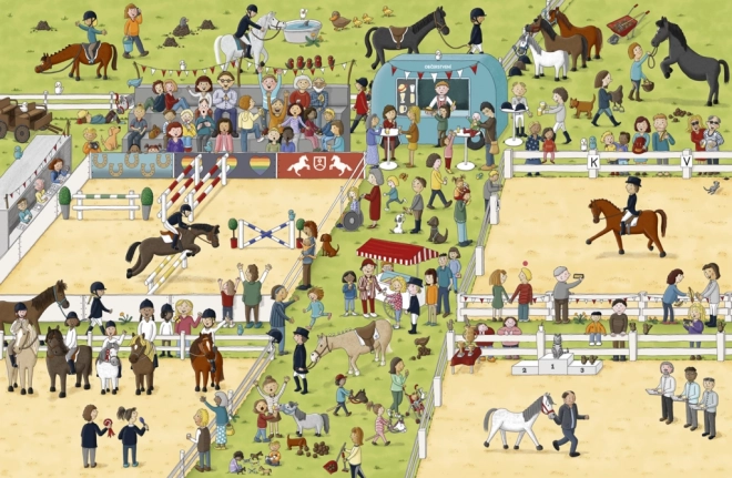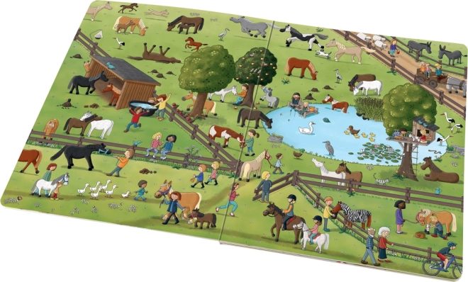 Această carte ilustrată pentru copii vă poartă într-o excursie de o zi în lumea cailor și a poneilor. Veți pătrunde în viața de la ferma de cai, veți porni la plimbare, veți susține la curse și îi veți urmări pe armăsari, iepe și mânji pe pășune. Pe fiecare pagină dublă veți găsi personaje și animăluțe recurente, pe care le puteți descoperi iar și iar – jocul de căutare interactiv susține abilitățile de observație, concentrarea și bucuria descoperirii.
