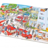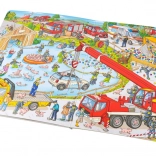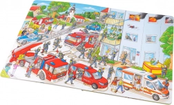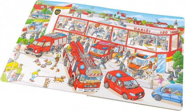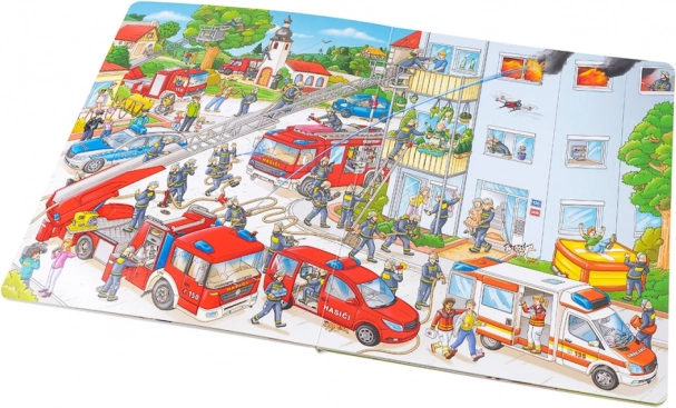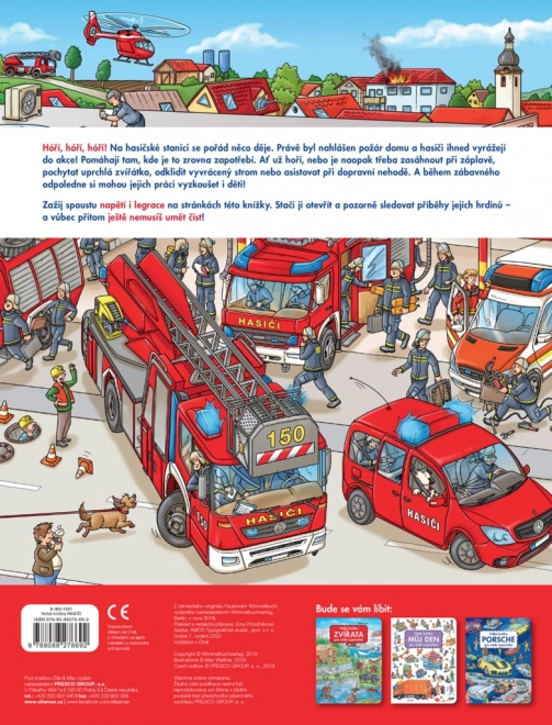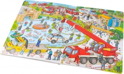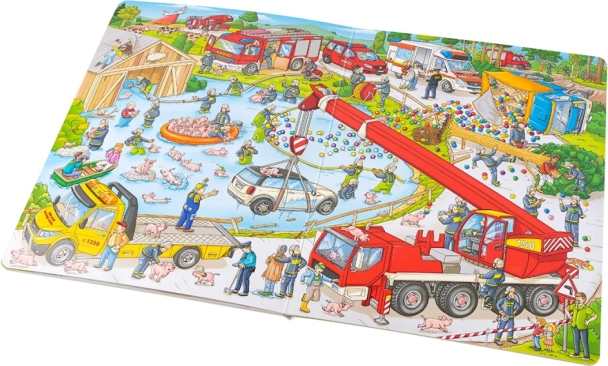 Această mare carte ilustrată îi poartă pe micii cititori în lumea plină de acțiune a pompierilor. Copiii vor vedea cum se pregătește plecarea la intervenție, cum funcționează scara lungă, furtunurile și alte echipamente, și cum are loc salvarea oamenilor din clădiri în flăcări. Ilustrațiile sunt bogate în detalii și invită la povestirea de istorii.