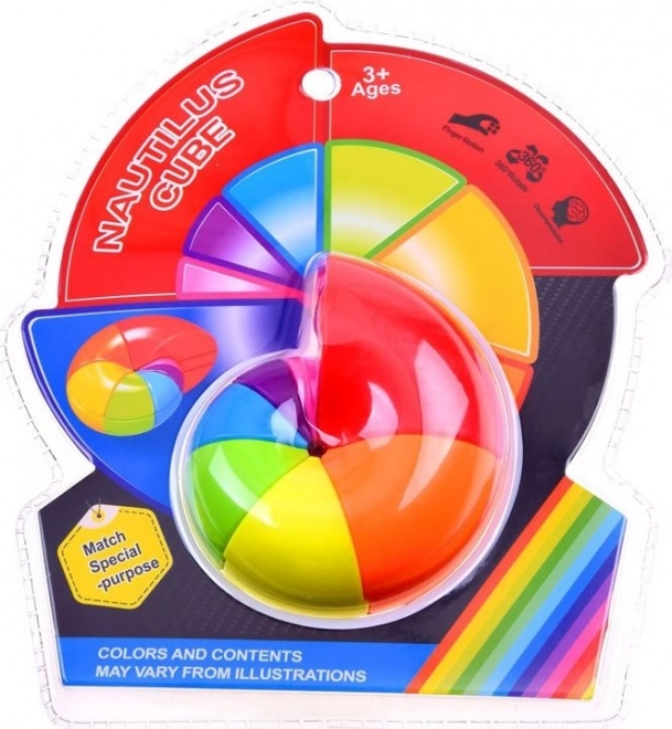 Spirală colorată rotativă în formă de cochilie. Fiecare dintre cele șapte părți colorate este alcătuită din trei piese. - amestecă prin rotire și reasamblează Nautilus în forma inițială - dezvoltă motricitatea fină, logica și strategia - execuție de calitate și rezistentă Pachetul include un ghid ilustrat. Dimensiunea puzzle-ului asamblat aprox. 8,5 x 6 cm