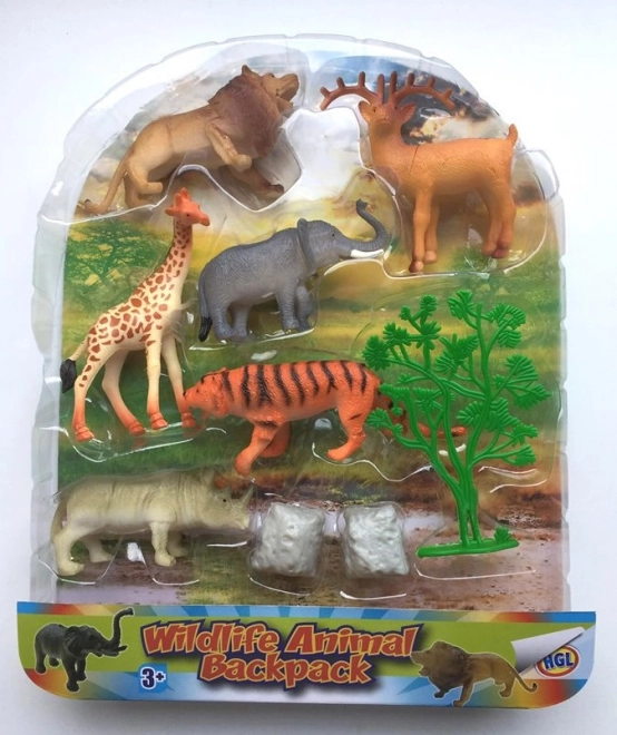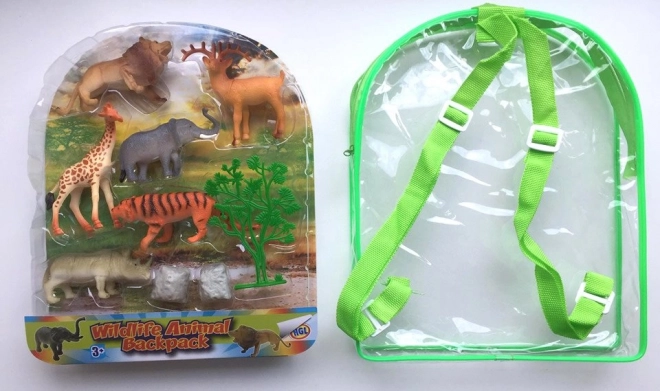 Set distractiv cu 6 figurine cu animale sălbatice într-un rucsăcel practic: leu, tigru, cerb, rinocer, elefant și girafă cu accesorii. Rucsăcelul transparent cu bretele reglabile ușurează transportul și depozitarea; figurinele măsoară aprox. 8 × 5 × 3 cm.