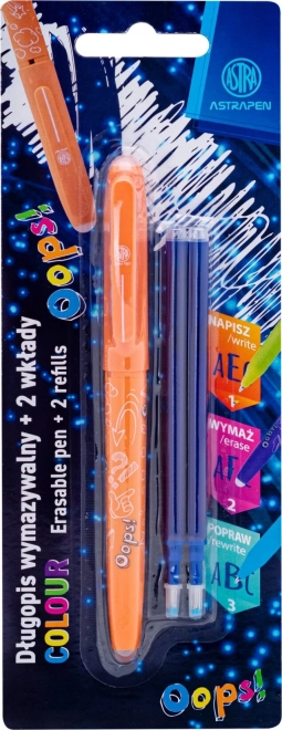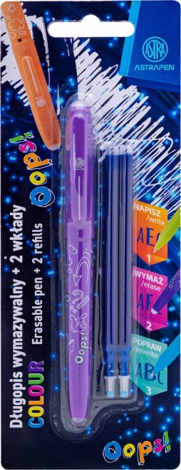 Practicul pix cu gumă ASTRA OOPS! cu lățimea fină a liniei de 0,6 mm este ideal pentru școală și birou. Conține cerneală specială care poate fi ușor ștearsă cu ambele capete ale pixului, iar datorită prizei ergonomice oferă o scriere confortabilă, fără oboseală. Pachetul include 2 rezerve de schimb pentru o durată de utilizare mai mare.