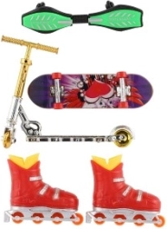 Descoperă distracția fără sfârșit cu setul pentru degete dedicat micilor pasionați ai sporturilor urbane. În pachet găsești un mini skateboard, waveboard, role in-line și o trotinetă pentru antrenarea trucurilor și jocul imaginativ. Ideal pentru dezvoltarea motricității fine și a coordonării, potrivit de la 3 ani. Trucuri pentru degete, mix de variante coloristice, execuție din plastic rezistent și dimensiuni compacte pentru joacă acasă și în călătorii.