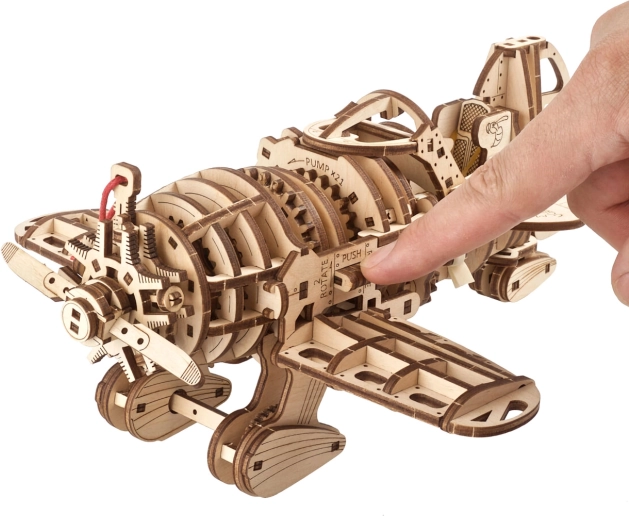 Observați mișcarea pistoanelor în motorul în stea și bucurați-vă de distracția interactivă cu modelul din lemn.