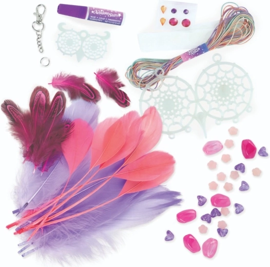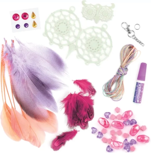Pachetul conține 2 baze de capcană de vise fosforescente, fire de bumbac, 28 de pene, 28 de mărgele stilate, 6 autocolante cu pietricele și lipici pentru bijuterii.