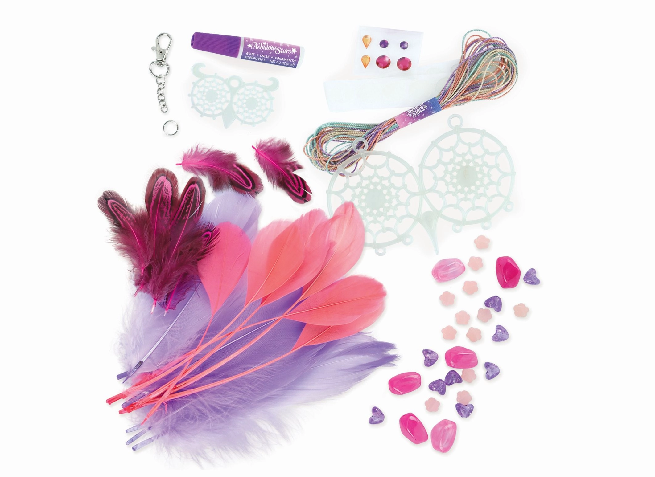 - 2 baze pentru capcană de vise, 2 culori de fir de bumbac, 28 de pene, 28 de mărgele, 6 autocolante cu pietricele, lipici pentru bijuterii
