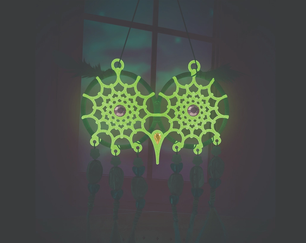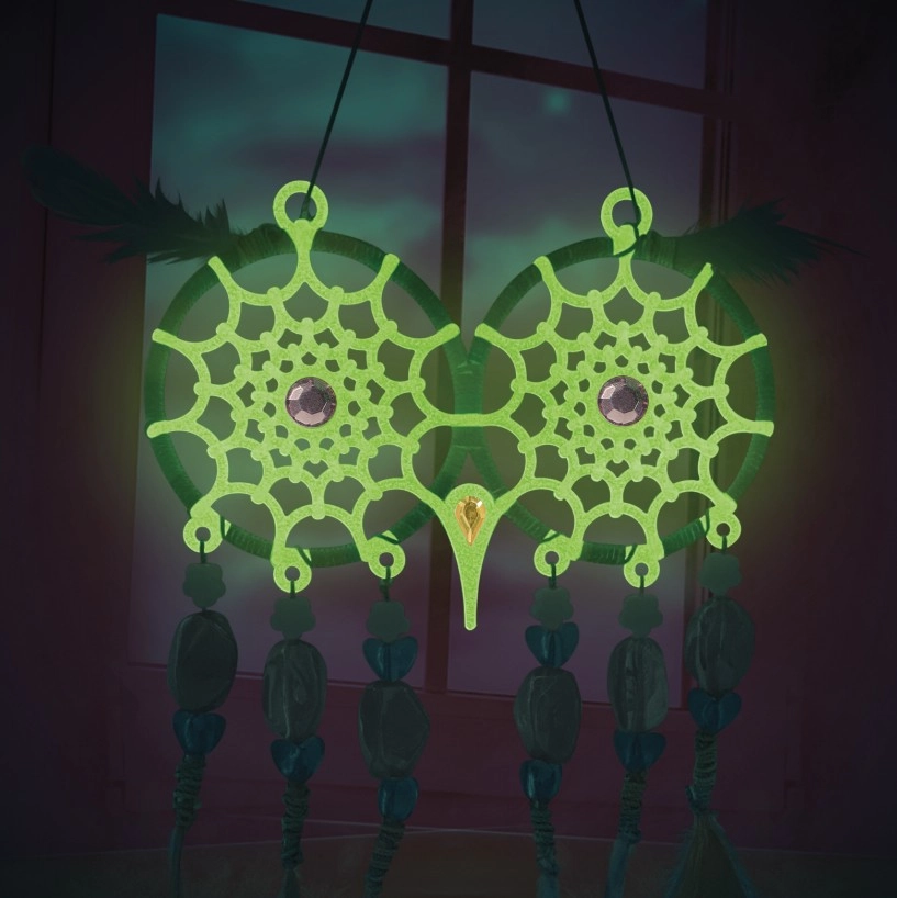 Materialele speciale ale capcanei de vise, după expunere la lumină, luminează discret, creând noaptea un efect luminos liniștitor și o decorațiune originală pentru cameră.