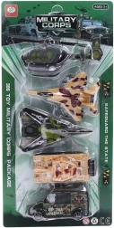 Acest set militar versatil oferă copiilor multe posibilități pentru scenarii creative și dinamice. Elicopterul de 16,5 cm este completat de două avioane de vânătoare, un tanc robust și o mașină de teren. Datorită mecanismului cu întoarcere și roților libere, vehiculele sunt ușor de controlat și rulează rapid.