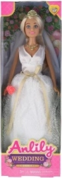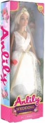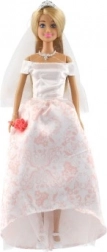 Păpușa este îmbrăcată într-o rochie de mireasă minunată cu model de dantelă și voal, care adaugă o notă de eleganță.