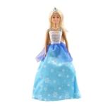 Păpușa are o rochie albastră minunată cu detalii de fulgi de zăpadă, care îi conferă un aspect de basm.