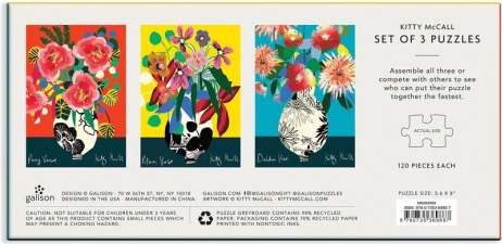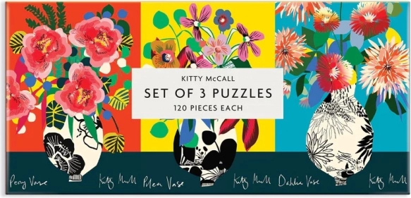 Explorați setul de puzzle-uri artistic Kitty McCall 3 în 1, fiecare cu 120 de piese, cu modele florale vibrante. Perfect pentru copii și adulți, ecologic și ambalat elegant.