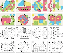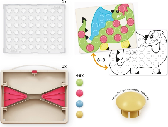 Fantacolor Junior Play Eco+ este un mozaic educativ inteligent, care îi îndeamnă pe copii la creativitate și răbdare. Datorită plăcii transparente perforate, copiii introduc cu ușurință țărușii mari, rotunzi, în orificii și, urmând cartonașele ilustrate, compun motive drăguțe cu animale și obiecte.