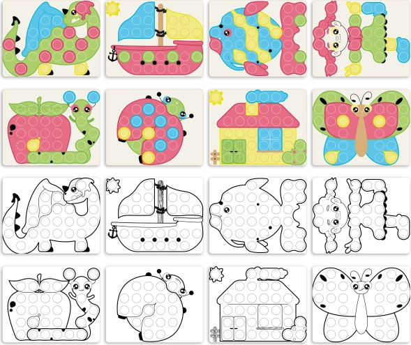 Include 8 cartonașe ilustrate cu motive simple și amuzante, care dezvoltă creativitatea și percepția vizuală.