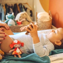 Ochii, obrajii și gurița brodate, fără piese mici, asigură joacă în siguranță încă de la naștere. Chipul din bumbac este plăcut la atingere.