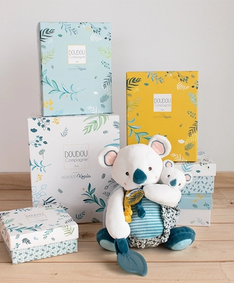 Adorabila koală de pluș Yoca cu puiul ei este primul prieten ideal pentru nou-născut. Oferă finețe, confort și o îmbrățișare liniștitoare. Într-o cutie cadou elegantă, încântă ca dar de naștere sau de Crăciun. Fabricată din pluș moale premium, în conformitate cu normele europene CE și potrivită de la naștere.