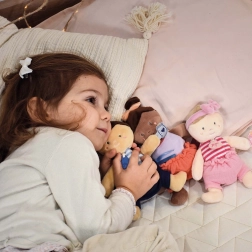 Această păpușă catifelată, în culoare portocalie, este jucăria ideală pentru bebeluși. Este ușoară, se potrivește bine în mânuțe și, datorită designului moale, copiii o pot manevra foarte ușor. Păpușa ține în mână o sticluță și susține dezvoltarea motricității fine și a imaginației.