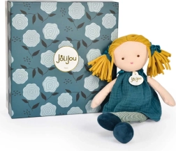 Păpușa Jade de la Doudou Jolijou este o însoțitoare blândă pentru bebeluși și preșcolari. Aspectul ei boho este completat de dresurile în dungi, rochița turcoaz și părul blond „spaghete” prins în cozi. Datorită execuției textile moi, este excelentă pentru îmbrățișat și maxim de sigură.