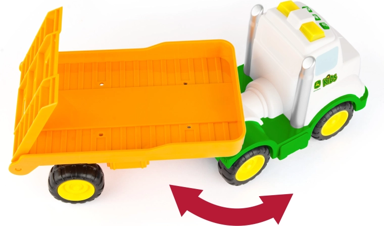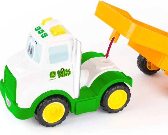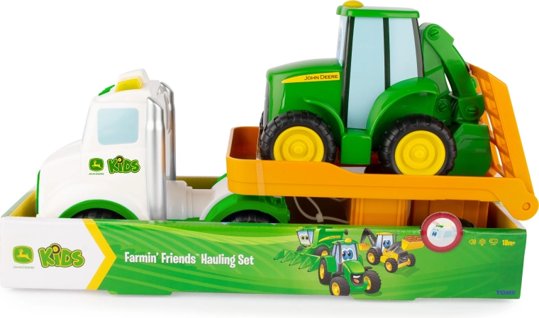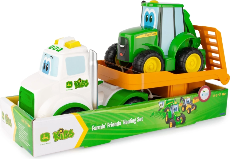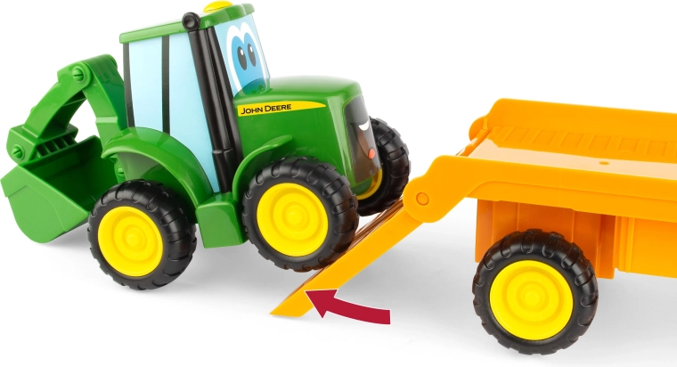 Acest set de joacă combină capul tractor cu rampă și tractorul prietenos Johnny în culorile clasice JOHN DEERE. Copiii își exersează motricitatea fină la încărcare și descărcare și, în același timp, își dezvoltă imaginația în jocurile de fermă. Datorită lungimii de 37 cm, setul este ușor de apucat și stabil.