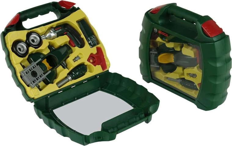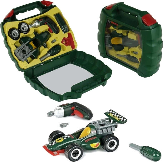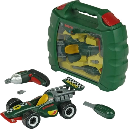 Acest set realist, sub licența BOSCH mini, include șurubelnița electrică pentru copii Ixolino cu bit rotativ și efect sonor, șurubelniță manuală, șuruburi și toate piesele necesare pentru construcția mașinii de curse verde închis. Totul este ordonat într-o valiză din plastic rezistent, cu capac transparent și mâner confortabil, astfel încât jucăria poate fi luată ușor oriunde.