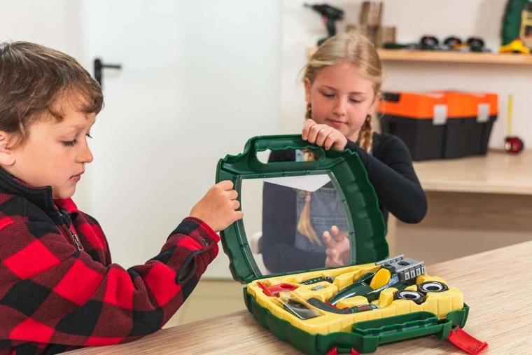 Set de construit pentru copii cu mașină de curse, în valiză practică, cu șurubelniță electrică licențiată BOSCH Ixolino de la KLEIN, aduce ore de distracție creativă. Copiii pot asambla singuri mașina folosind unelte sigure, apoi se pot juca cu ea. Include piese interschimbabile, roți mari și autocolante pentru personalizarea aspectului. Dezvoltă motricitatea fină, stimulează imaginația și, datorită construcției robuste, rezistă jocului zilnic.