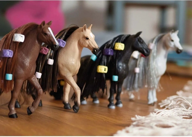 Include agrafe colorate, mărgele și un pieptene pentru diverse opțiuni de styling și experimentare cu coafurile ecvestre.