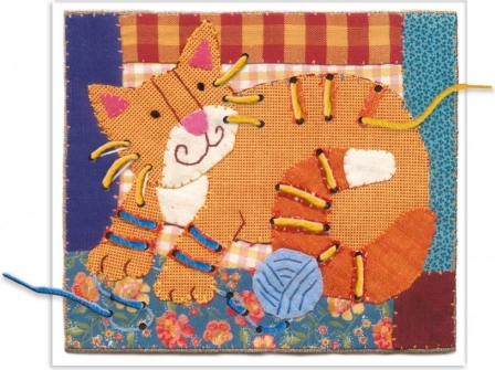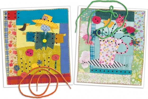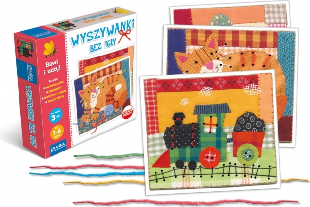 Acum treci la treabă! În cutie vei găsi șnururi colorate și imagini frumoase în stil patchwork. Iar pe imagini vei vedea o locomotivă, o sperietoare de ciori, o pisică, un om de zăpadă și alte minunății. Acum poți broda și fără ac!