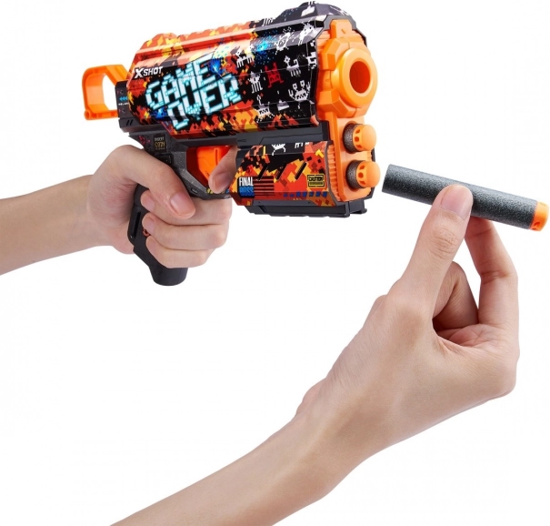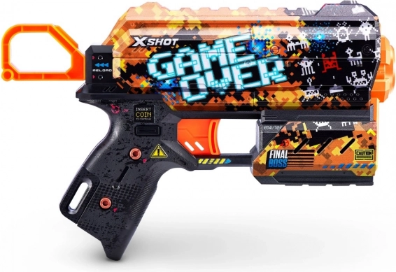 Adu stilul jocurilor video în bătălii cu pistolul X-Shot Skins Flux cu motivul Game Over. Datorită celei mai noi tehnologii de imprimare, blasterul arată extrem de atrăgător, iar formele ergonomice și construcția ușoară oferă control confortabil chiar și în sesiunile mai lungi.