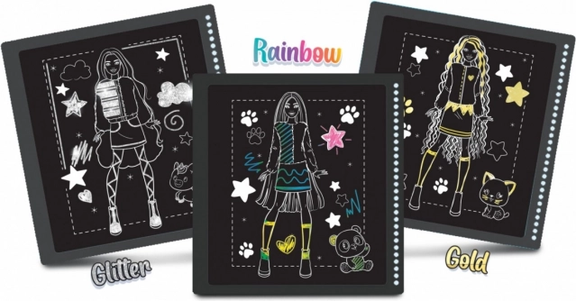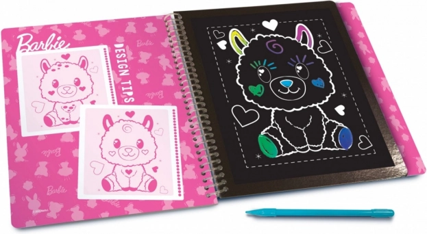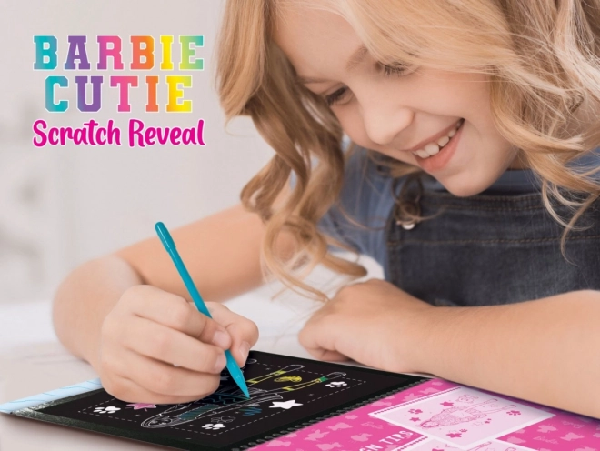 Descoperiți magia culorilor cu Barbie în stil adorabil. Folosind pixul inclus, razuiți stratul de hârtie neagră și dezvăluiți culorile vii ale curcubeului în nuanțe fantastice.