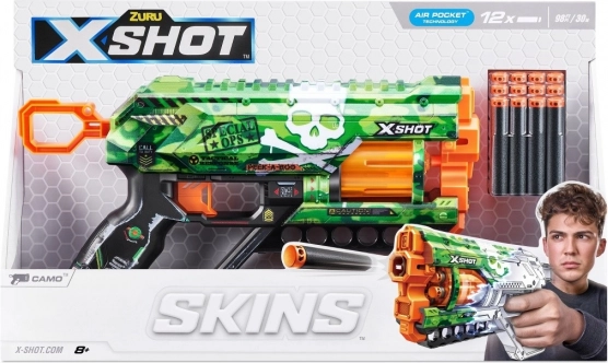 Obține un avantaj în bătăliile pline de acțiune cu blasterul X-SHOT Skins Griefer în design camo. Tamburul rotativ pentru 6 darduri, raza de până la 27 m și 12 darduri din spumă compatibile incluse în pachet pentru distracție îndelungată și sigură. Pistol ușor, rezistent și precis, ideal pentru jocuri în aer liber.